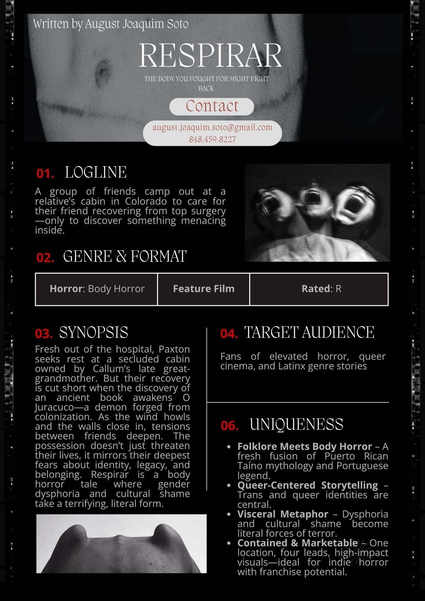I had top surgery a year ago and I thought my nightmares would make for good scenes in a body horror. I then attended a screenwriting class at the College of Charleston with Professor Michael Smallwood and our final was to write a feature-length screenplay. I've never written horror before and found out my Professor loved body horror so that's how “Respirar” came to be. It was originally titled “Final Cut” and the big bad were these two cringy possessed dolls. When I saw the original story wasn't working I stripped it down and decided to dig deep into my personal life and use my insecurities regarding my top surgery and my disconnect with my Puerto Rican roots.