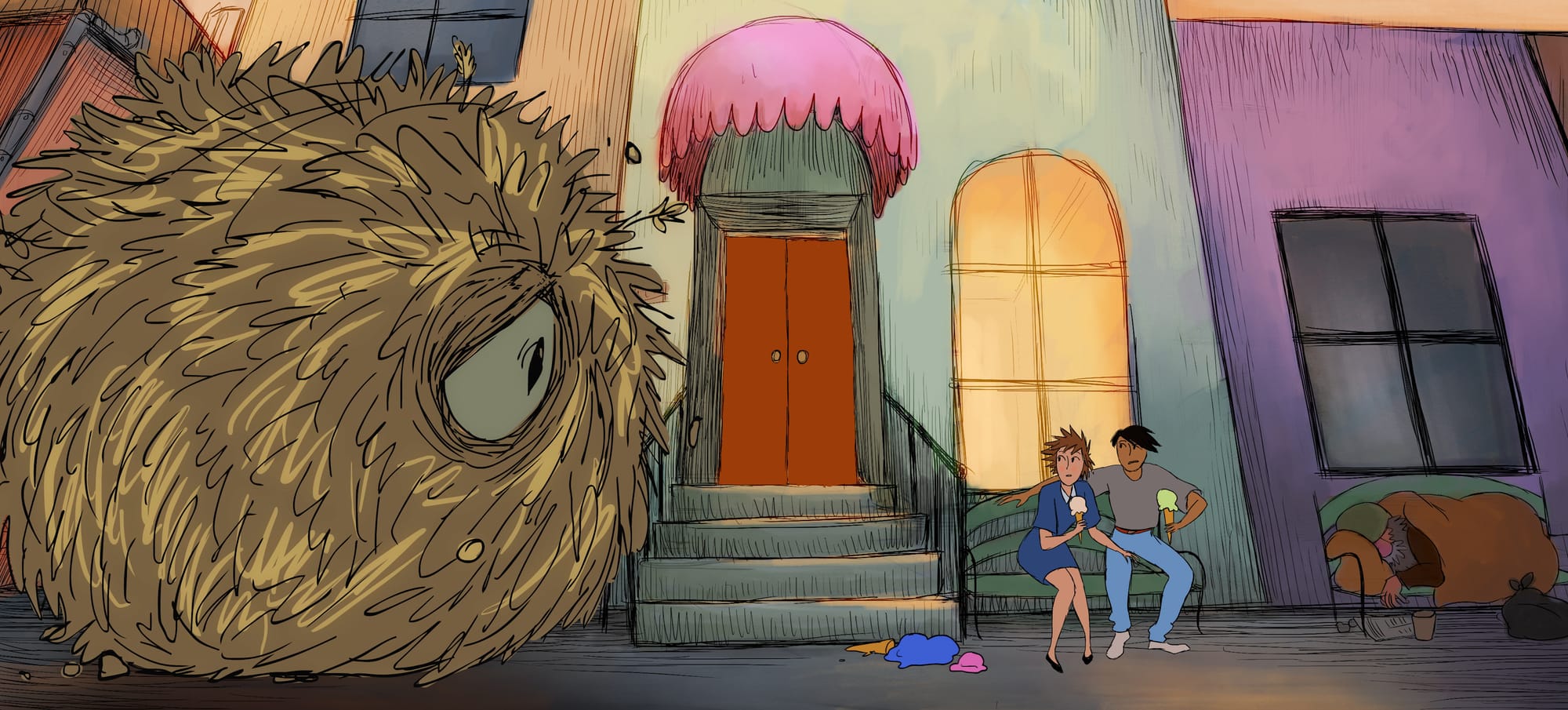 There was a version of the score that was a lot darker earlier on when the ball's kind of medium sized. I wanted to make sure that we were still following the story and had enough room to grow to where it actually becomes scary. I think that what Zach and Pierre did towards the end, where the ball's really scaring people and everyone's running away, that in some ways was their creative input. Then, when I heard it, I was like, oh, this totally makes sense. Because in some ways, it becomes a collaboration between the animator and the composers at that point. I've done the storyboarding, I had the script. We did a lot of back-and-forth. But then Katherine created this eerie world where the ball's eye looks back at the people. I think that it automatically gives a cue to the composers of what tone they want to add to it. So it's extremely collaborative, you become a bit of a hive mind as you're working.