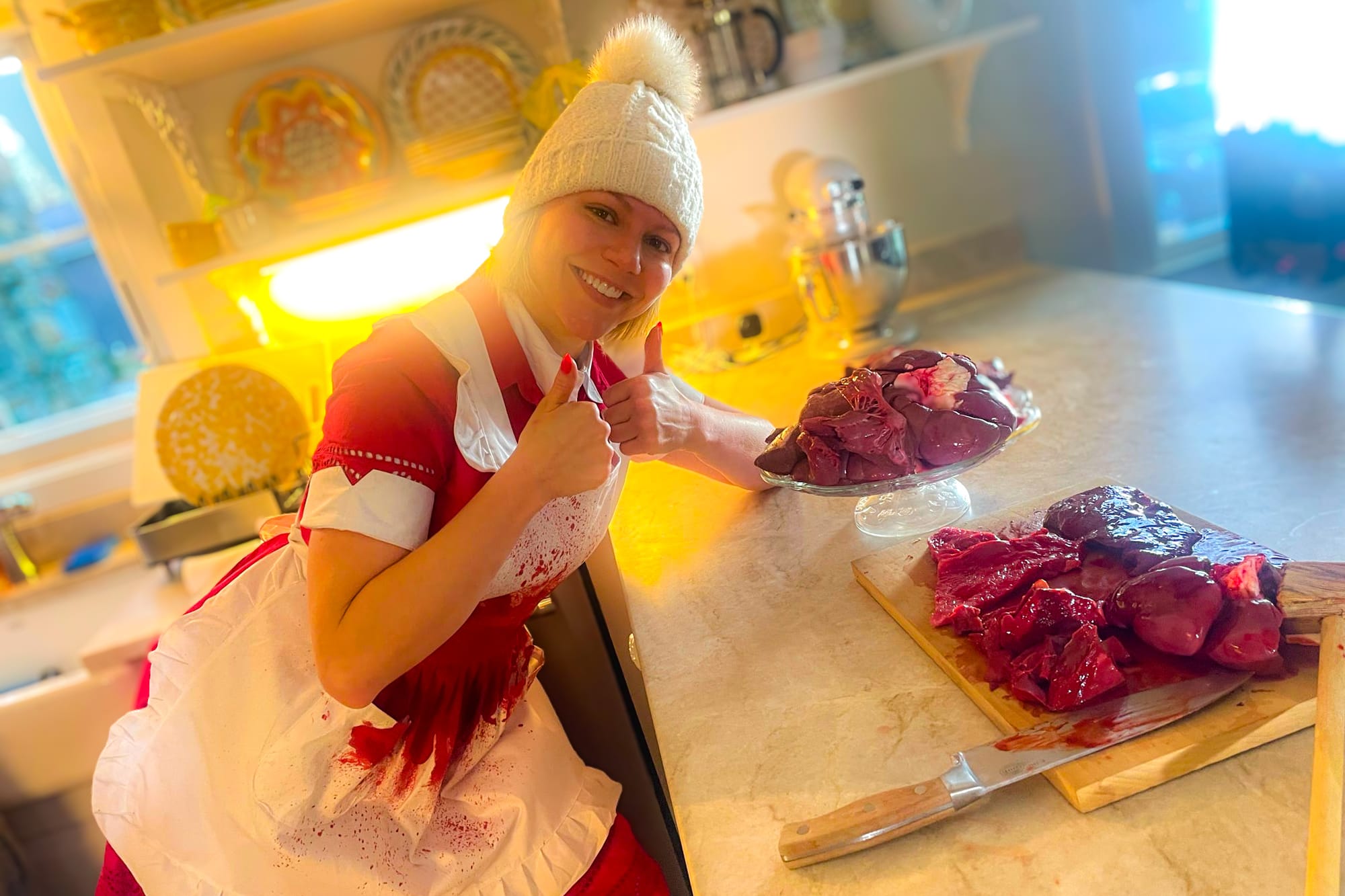 Building the dollhouse prop/Housewife’s head! That took over a month to perfect (with tweaks being made right up until the shoot/even some on the day), but it required a lot of trial and error. It’s Greta’s pride and joy as the designer, but both of us had to be involved pretty much every step of the way to make sure the size, color, details, materials, fit, design… the list truly goes on and on. It was based on Miranda’s art, but it was our job to interpret a 2D animation and how it might be realized as a physical object that someone had to actually wear for long periods of time (shoutout to our Housewife actress Colleen Grate, she was a trooper!) It had to blend story and practicality in a way we hadn’t experienced before, all while remaining true to what makes Housewife such an iconic character to begin with.