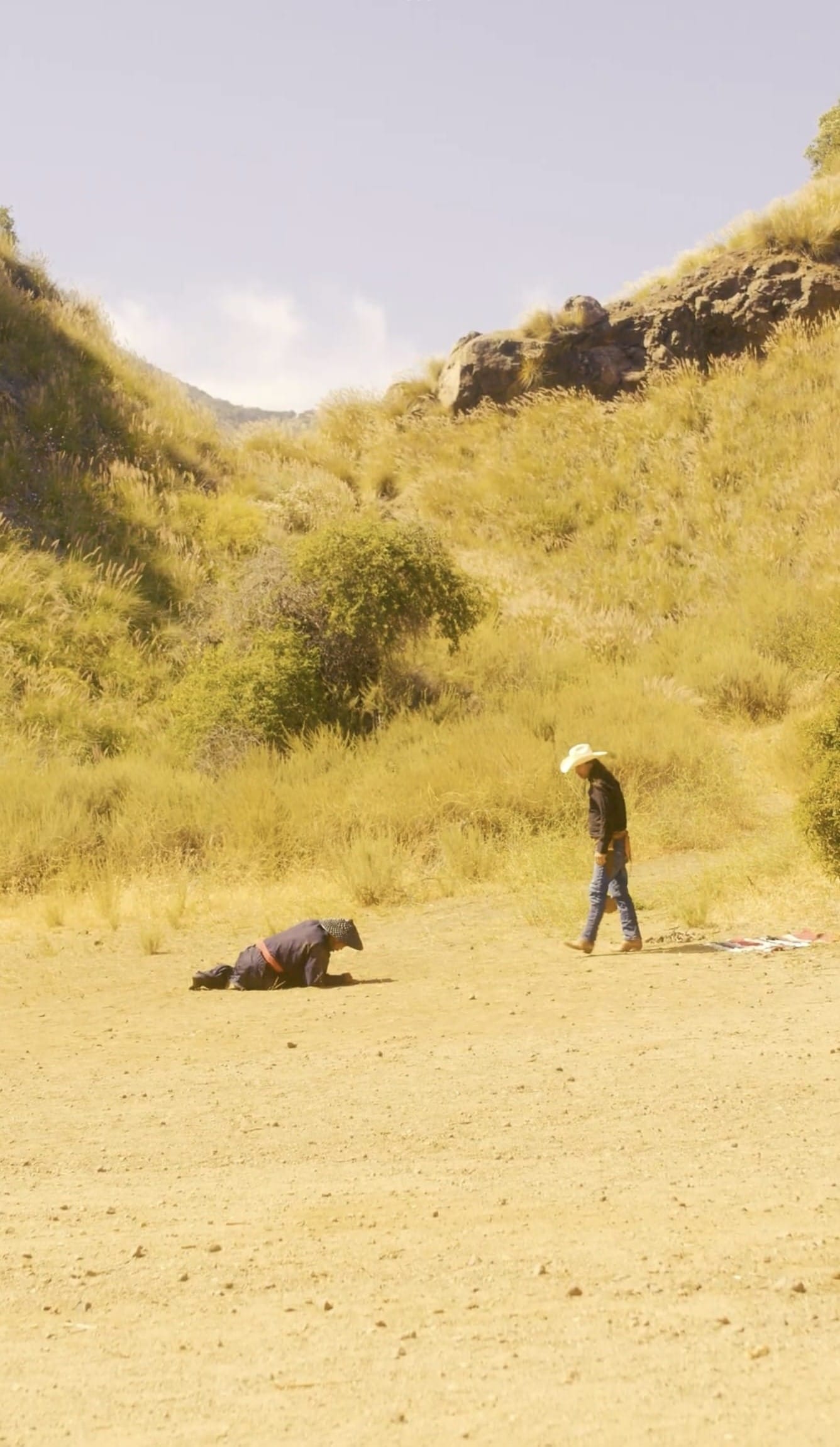 With my cinematographer Daniel, we talked about reframing the codes of the genre. Westerns are usually defined by their vast horizontal landscapes: endless skies and sweeping plains. We wanted to see what would happen if we flipped that. We gave the image height instead of width: the hills became taller, the sky more infinite, and our characters more imposing within the frame.