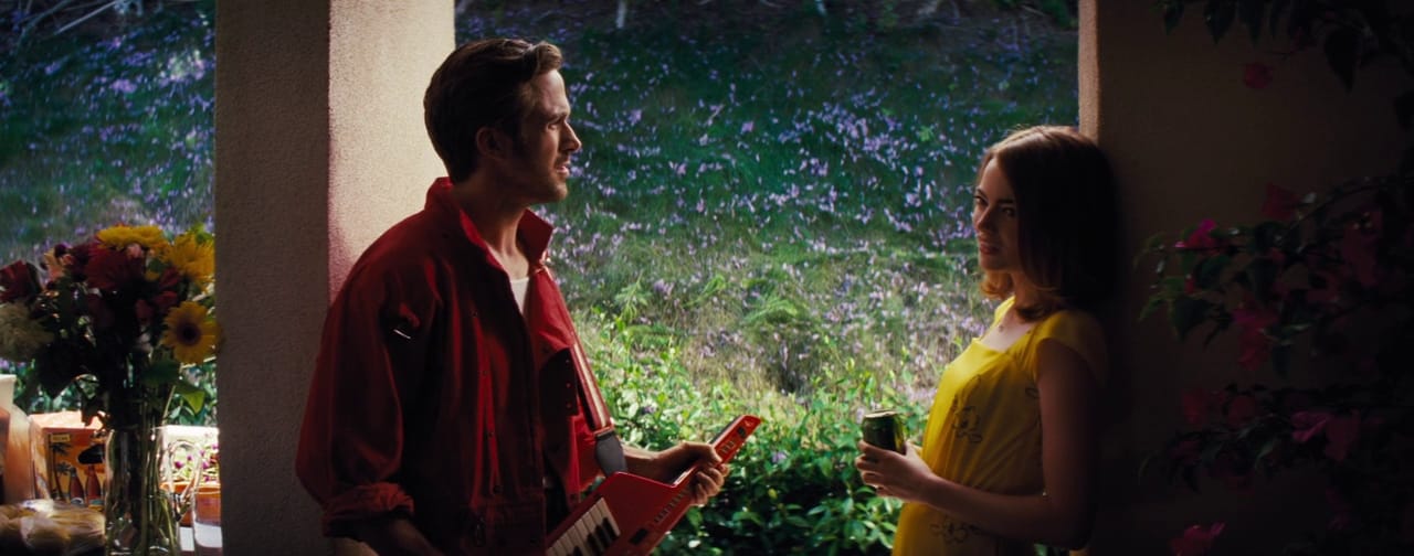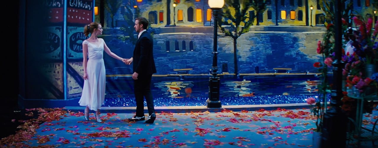Chazelle screened films that his crew could draw from for inspiration, the most influential of which were: The Young Girls of Rochefort, Umbrellas of Cherbourg and Model Shop. Through these films the crew decided that a very controlled production design, created in close collaboration with the costume design team, would be the most effective way to be able to bring across the bright colors of the technicolor era. Colors were assigned to specific characters, and to the emotional arcs of Mia (Emma Stone) and Sebastian (Ryan Gosling). These color themes were also carried through to the design of their rooms, the clothing they wear, and the lighting. This careful decision is a large part of the magical romantic feeling the audience experiences while watching La La Land. Additionally, to make sure that the lighting in the exterior scenes (almost all of which take place at nighttime or dusk), felt as impactful and romantic as possible, the team used actual light instead of CGI or artificially manipulating the sky. In Sandgren's own words, "We always captured it in a very precise few minutes of the evening, in-camera."